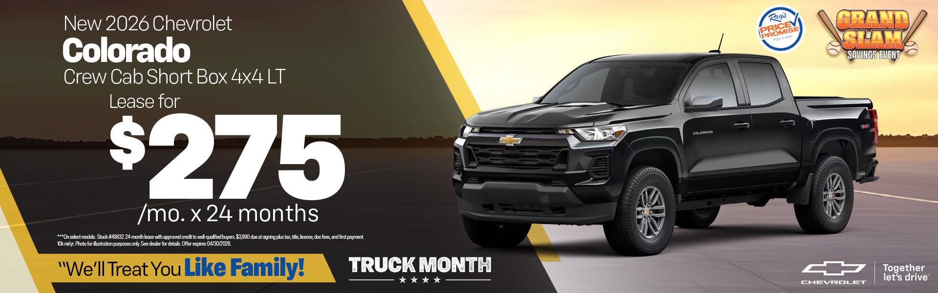 On select models. Stock #49832. 24-month lease with approved credit to well-qualified buyers. $3,990 due at signing plus tax, title, license, doc fees, and first payment. 10k mi/yr. Photo for illustration purposes only. See dealer for details. Offer expires 04/30/2026.