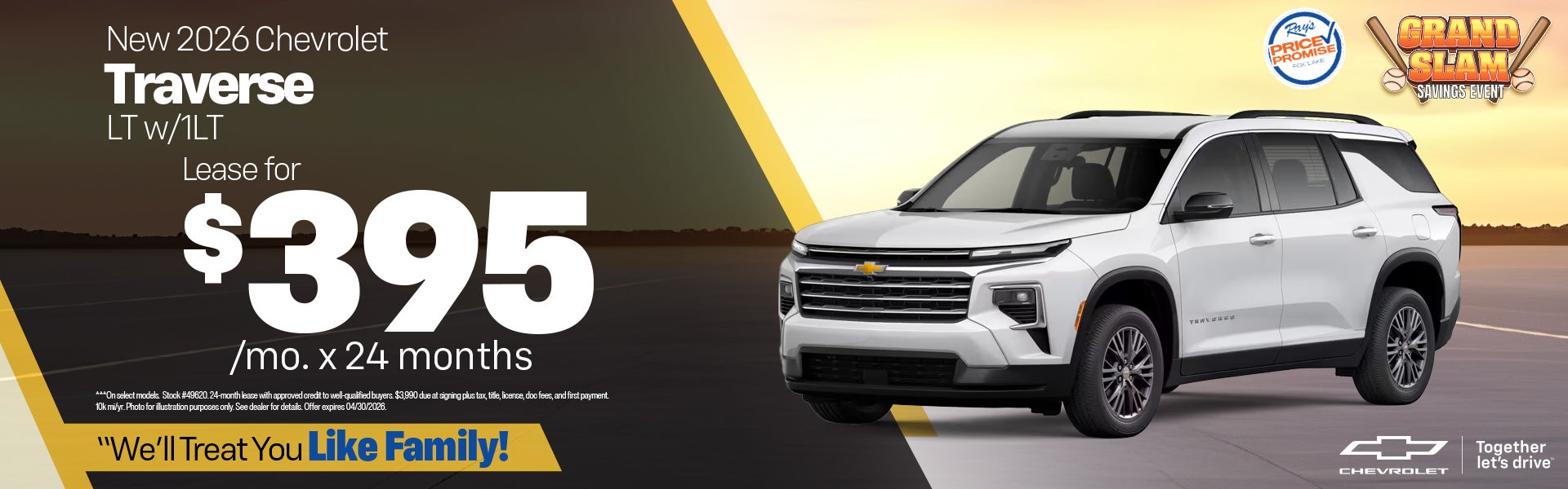 On select models. Stock #49620. 24-month lease with approved credit to well-qualified buyers. $3,990 due at signing plus tax, title, license, doc fees, and first payment. 10k mi/yr. Photo for illustration purposes only. See dealer for details. Offer expires 04/30/2026.