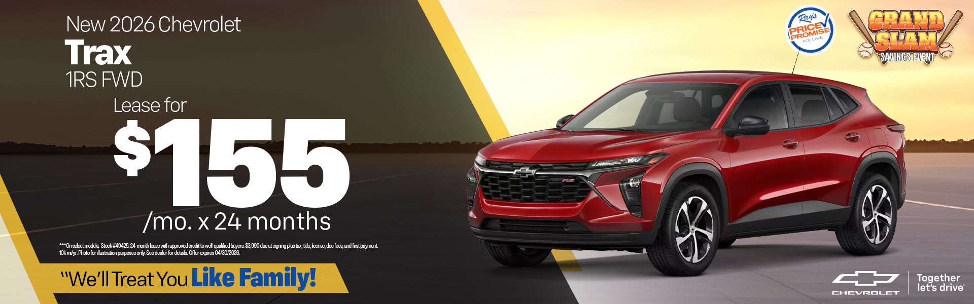 On select models. Stock #49425. 24-month lease with approved credit to well-qualified buyers. $3,990 due at signing plus tax, title, license, doc fees, and first payment. 10k mi/yr. Photo for illustration purposes only. See dealer for details. Offer expires 04/30/2026.